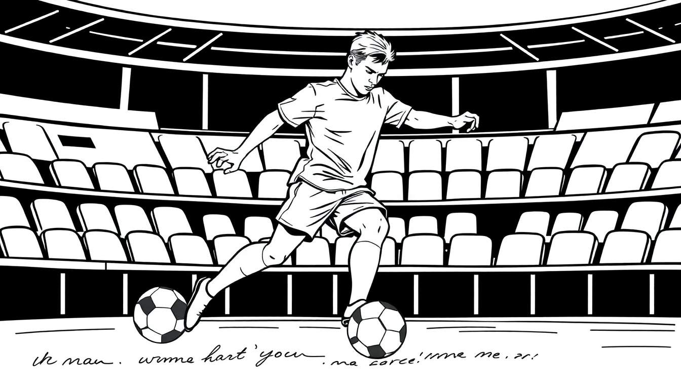 Een zwart-witte kleurplaat van een jonge voetballer die individueel traint in een verlaten voetbalstadion. Perfect voor jonge fans om in te kleuren!
