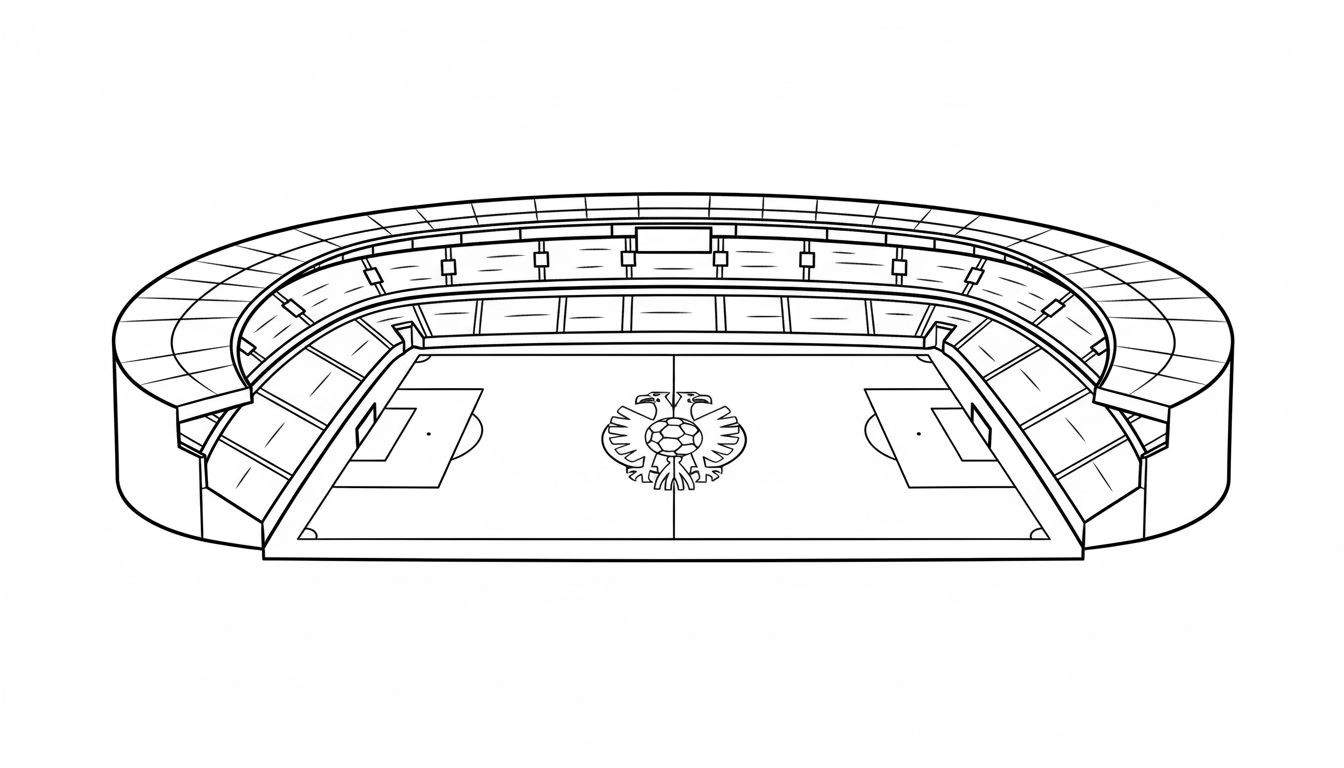 Het meest opvallende detail op het veld is ongetwijfeld het grote embleem: een majestueuze tweekoppige adelaar met gespreide vleugels, die trots een voetbal vasthoudt. Dit symbool, sterk gelijkend op het bekende logo van de Duitse voetbalbond (DFB), voegt een element van grandeur en historische kracht toe aan de kleurplaat. De tweekoppige adelaar is een eeuwenoud heraldisch symbool dat vaak geassocieerd wordt met macht, autoriteit en soevereiniteit, waardoor het stadion een bijna koninklijke uitstraling krijgt.