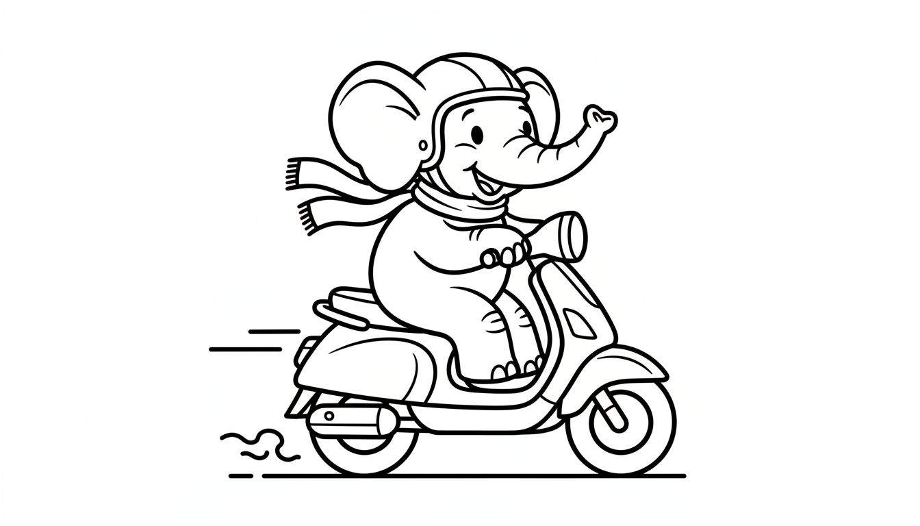 Gratis zwart-wit lijntekening van een blije cartoonolifant op een scooter, met helm en sjaal. Perfect voor kinderen om in te kleuren en hun creativiteit te uiten. Deze afbeelding straalt plezier en beweging uit met snelheidsstrepen.