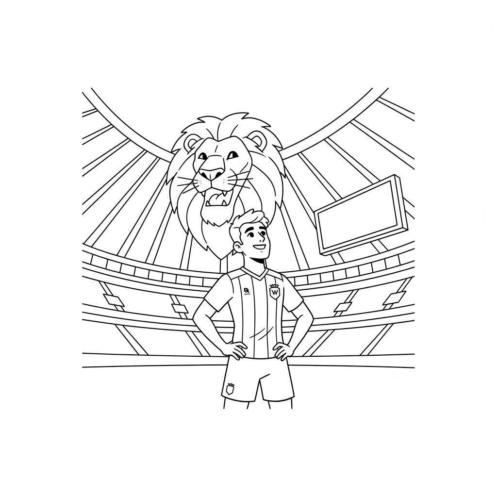 Deze dynamische Willem II kleurplaat toont een vrolijke, jonge voetballer met kort haar in sporttenue. Hij staat zelfverzekerd met zijn handen in zijn zij en kijkt opwaarts, omringd door de krachtige aanwezigheid van een brullende leeuw met indrukwekkende manen. Op zijn shirt zijn Willem II-gerelateerde logo’s zichtbaar, waaronder een ‘R’, een ‘W’ in een schild en een kroon, wat direct de link legt met de Tilburgse voetbalclub. De scène speelt zich af in een imposant sportstadion, met tribunes en een scorebord op de achtergrond. Perfect voor jonge Willem II-fans om in te kleuren!