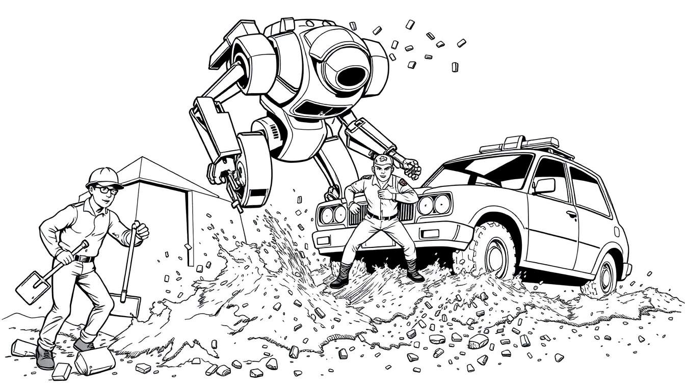 Stel je voor dat deze robot niet zomaar landt, maar een lang verloren artefact beschermt dat uit de aarde is opgestegen! Of misschien is het een reddingsoperatie, waarbij de robot juist probeert om de mensen in veiligheid te brengen na een catastrofe. De man met de schoppen zou een archeoloog kunnen zijn die de robot ontdekt, of een onverwachte held die de robot met zijn gereedschap wil afweren. En de agent? Die is er om de orde te handhaven, zelfs in het aangezicht van het onmogelijke. De auto zou deel kunnen uitmaken van een vluchtpoging of juist een poging om dichterbij te komen en te onderzoeken wat er aan de hand is. Jouw kleurstelling kan de toon van het verhaal bepalen: geef de robot een dreigende rode gloed, of juist een hoopgevend blauw licht. Laat het puin dramatisch oplichten met gele en oranje tinten, of juist de dreiging benadrukken met donkere, sombere kleuren.
