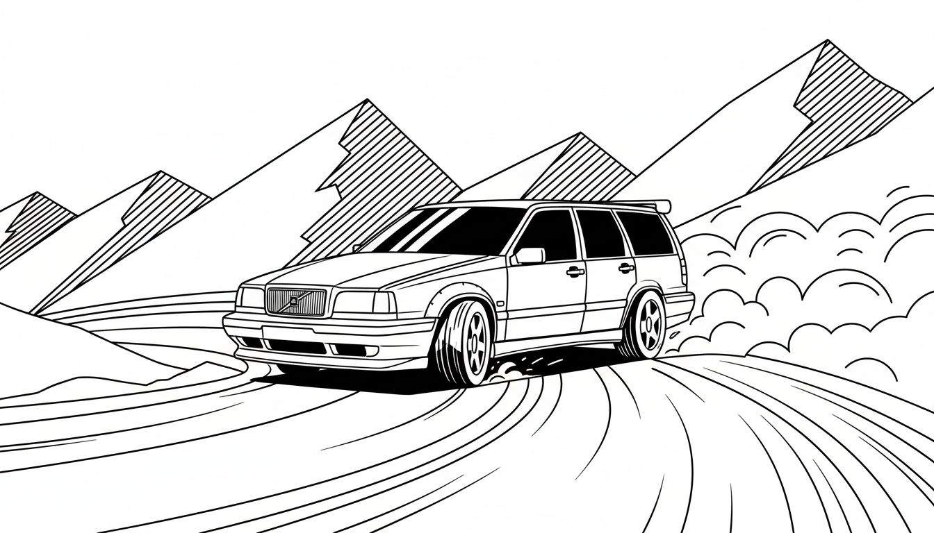 Gratis zwart-wit kleurplaat van een agressief ogende, gemodificeerde stationwagen die met hoge snelheid door een bocht driftt. Opstuivend materiaal en gestileerde bergen op de achtergrond benadrukken de dynamiek. Perfect voor auto- en tekenliefhebbers.