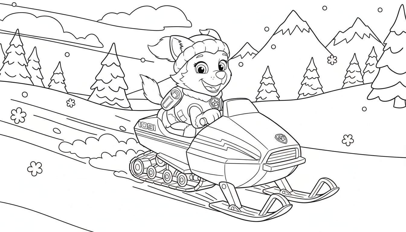 Deze schitterende kleurplaat neemt je mee op een avontuur met Everest, de geliefde husky uit Paw Patrol. Ze is te zien in haar element, vrolijk rijdend op een sneeuwscooter door een uitgestrekt winterlandschap. Met een warme muts op en een brede glimlach is ze helemaal klaar om de besneeuwde bergen te verkennen. De gedetailleerde lijntekening nodigt kinderen uit om hun favoriete kleuren te gebruiken en de scène tot leven te brengen, van de glanzende sneeuw tot de diepgroene dennenbomen en de felblauwe lucht.