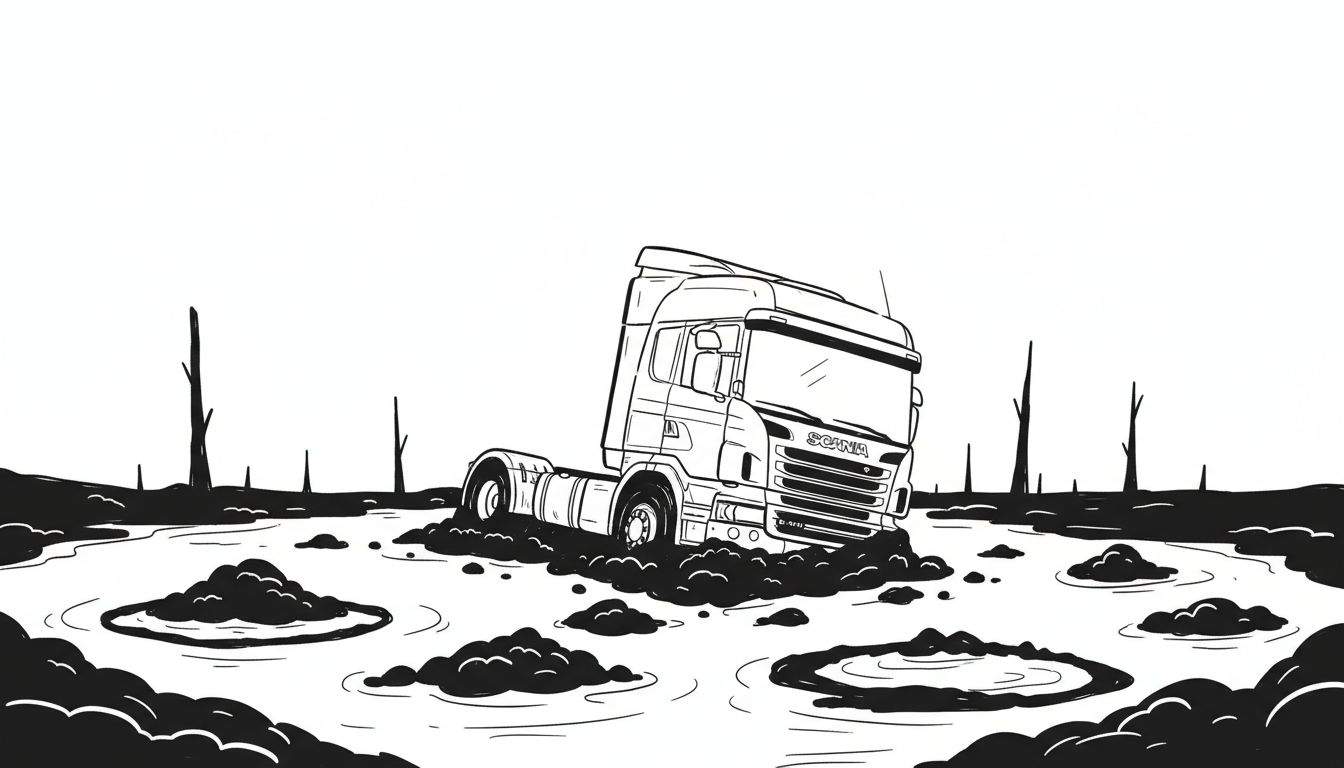Deze zwart-wit tekening toont een krachtige Scania vrachtwagen, een symbool van transport en arbeid, die onverwachts tot stilstand is gekomen. De trekker, ontdaan van zijn oplegger, is diep weggezonken in een immense plas donkere, dikke modder. De wielen zijn bijna volledig verdwenen onder het oppervlak, en de modder spat op, wat de dramatische strijd om te ontsnappen benadrukt. De omringende plas is bezaaid met kluiten van een donkere, vloeibare substantie, die rimpelingen vertonen die suggereren dat de modder nog steeds in beweging is of zojuist is opgewoeld.