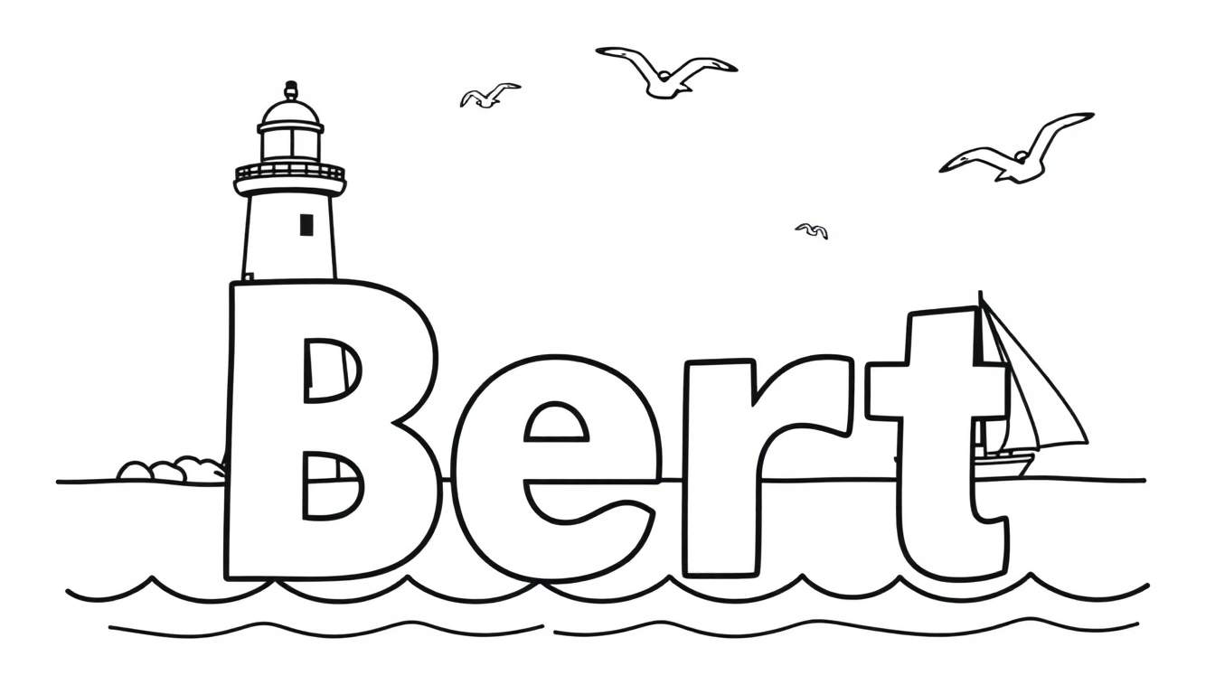 Duik in de wereld van de zee en de kust met deze fantastische kleurplaat! De naam ‘Bert’ is omgetoverd tot een waar maritiem meesterwerk. Bovenop de statige letter ‘B’ pronkt een vuurtoren, die met zijn licht de schepen veilig naar de haven leidt. Onder de letters kabbelen de golven vrolijk, alsof de naam zelf op reis is over de oceaan. En wat is een zeereis zonder avontuur? Aan de rechterkant, bij de letter ’t’, ligt een stoere zeilboot, klaar om de wind te vangen en de wereldzeeën te verkennen.