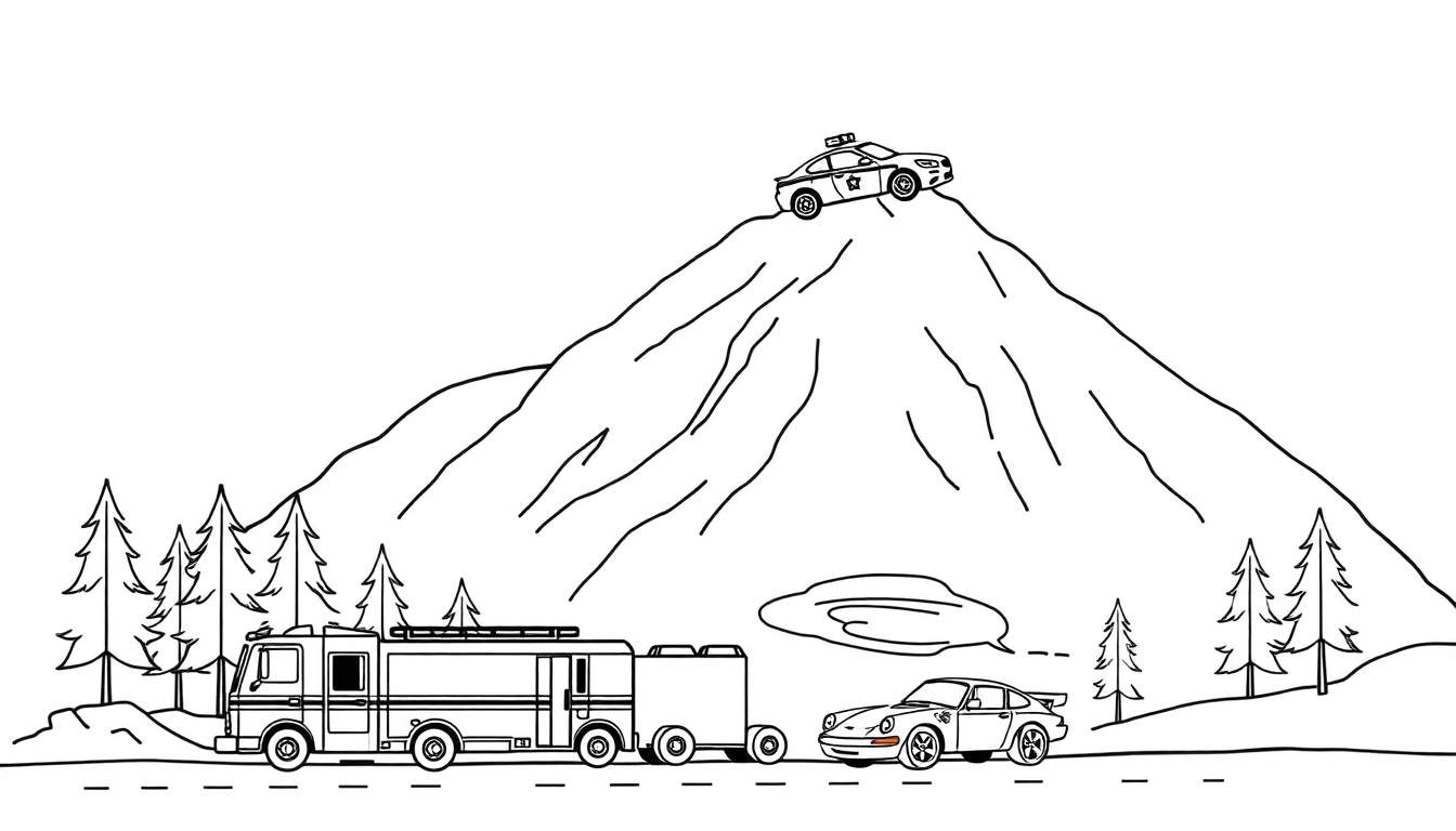 Ontdek dit spannende berglandschap, klaar om tot leven te komen met jouw favoriete kleuren! In het hart van de tekening torent een majestueuze berg boven alles uit. Wat een verrassing: bovenop de hoogste piek staat een politieauto, alsof hij daar net een bijzondere missie heeft voltooid of zich opmaakt voor een nieuwe rit. De omgeving is bezaaid met statige dennenbomen, die de bergflanken en de weg omringen. Aan de voet van de berg slingert een geasfalteerde weg zich door het landschap, met duidelijke stippellijnen die de rijrichting aangeven. Hier zien we een robuuste brandweerwagen, stoer een witte aanhanger trekkend. Vlak daarnaast, als een snelle tegenhanger, staat een glimmende sportwagen, die sommigen misschien herkennen als een model dat doet denken aan een Porsche.