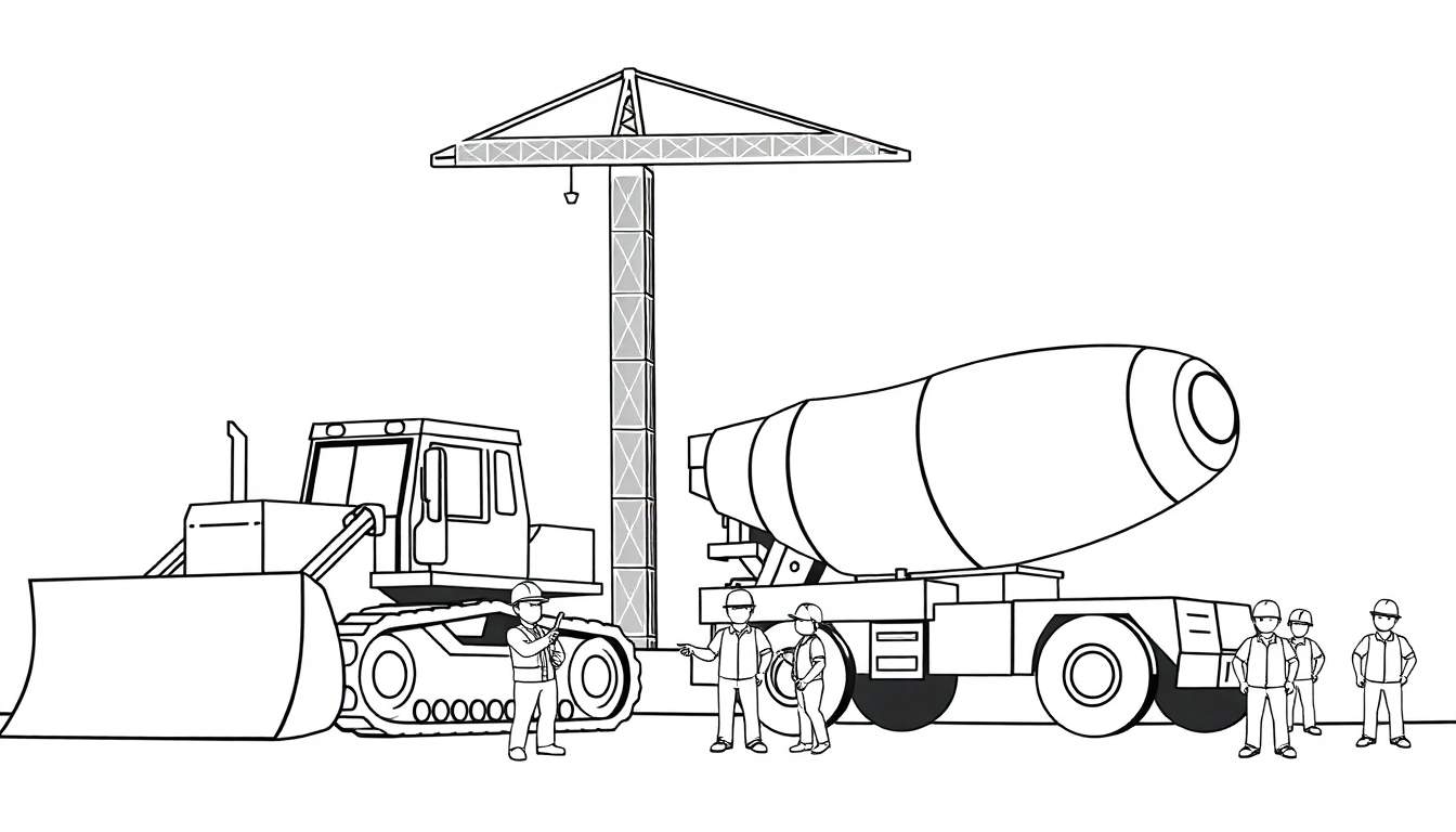 Verder naar rechts dompelt een grote betonmixer de scène onder in activiteit. De draaiende trommel belooft de aanvoer van vers beton, essentieel voor elk bouwproject. Rondom de mixer staan verschillende bouwvakkers, sommigen in gesprek, anderen druk bezig. De vrolijke gezichtjes en de diverse posities van de bouwvakkers geven de tekening extra dynamiek. Dit is niet zomaar een kleurplaat; het is een uitnodiging om de logistiek en teamwork op een bouwterrein te ontdekken.