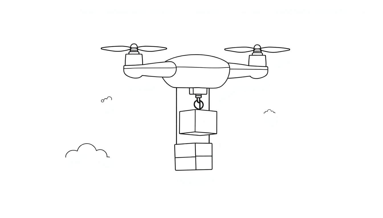 Een vrolijke kleurplaat van een futuristische drone die twee pakketjes door de lucht vervoert. Ideaal voor kinderen die houden van techniek en avontuurlijke leveringen. De eenvoudige lijntekening met zwevende wolkjes nodigt uit tot creatieve inkleuring.