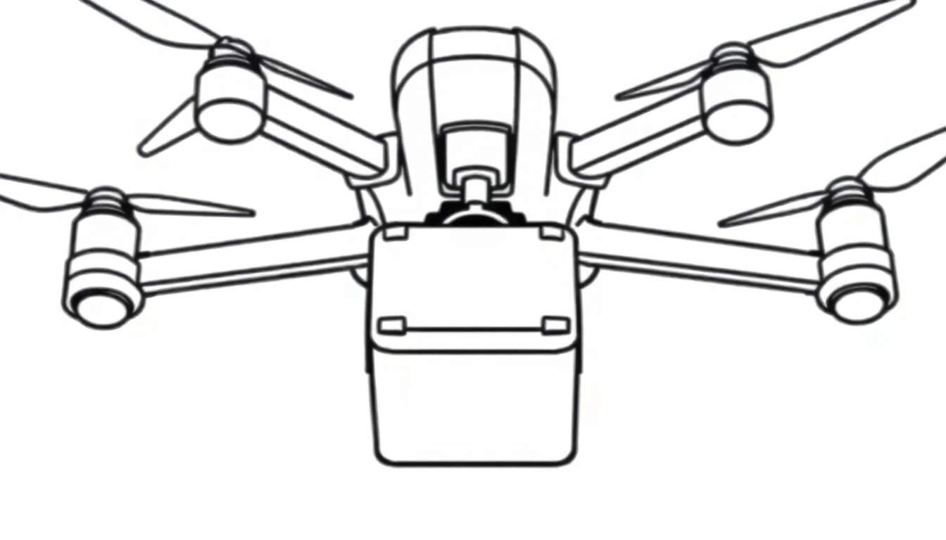 Gratis zwart-witte kleurplaat van een moderne drone (quadcopter) met vier propellers. De drone wordt frontaal en lichtelijk van onderaf getoond, met een centraal lichaam en een opvallend object onderaan, mogelijk een camera of pakket. Perfect voor kinderen en volwassenen die van technologie en vliegende objecten houden.
