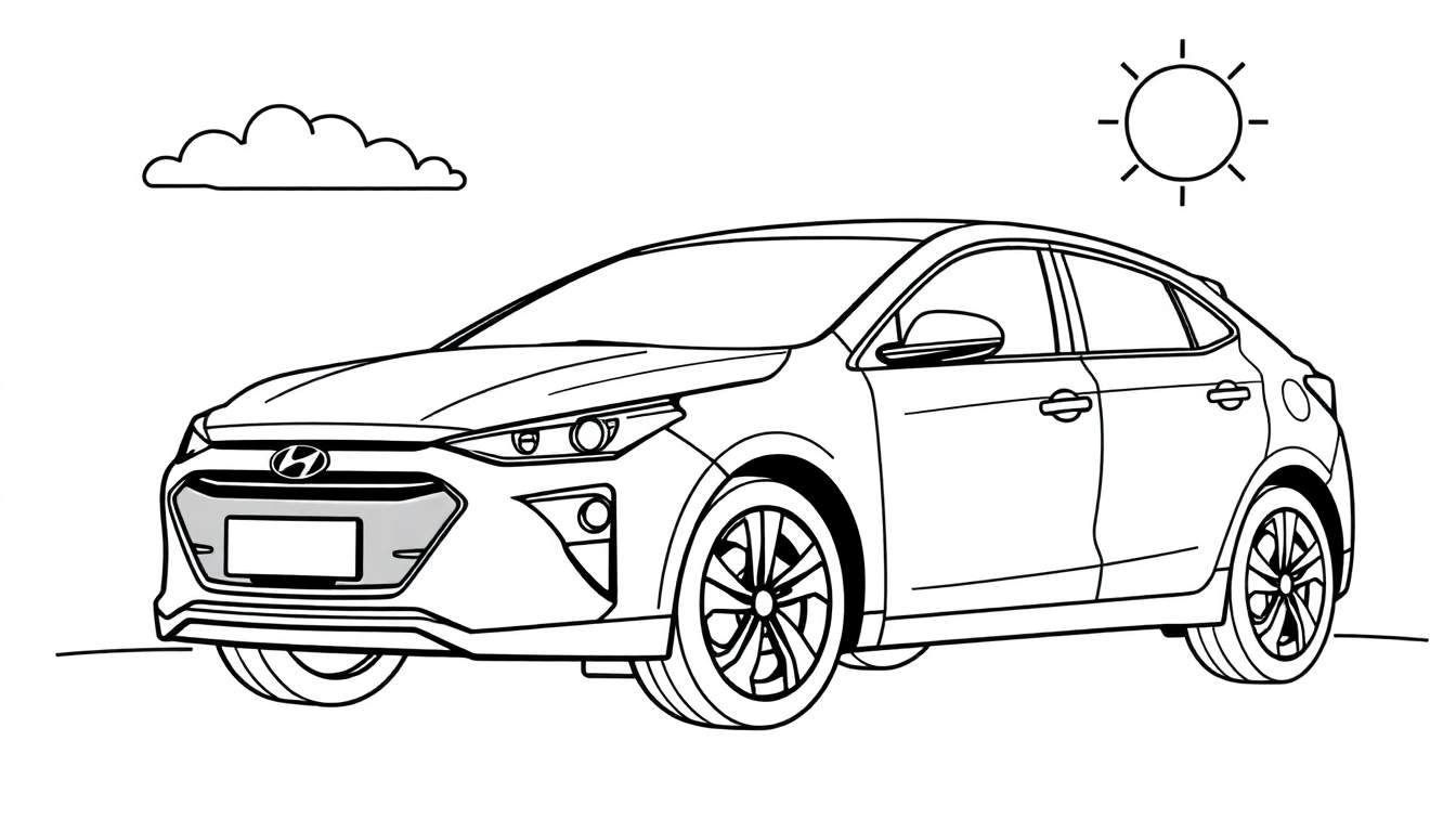 Gratis zwart-wit lijntekening van een Hyundai hatchback om in te kleuren. Deze kleurplaat bevat een gedetailleerde tekening van een auto met koplampen, mistlampen, grille, deuren, zijspiegels en wielen. De achtergrond is versierd met een vriendelijke zon en een zachte wolk. Perfect voor creatieve kinderactiviteiten en autoliefhebbers.