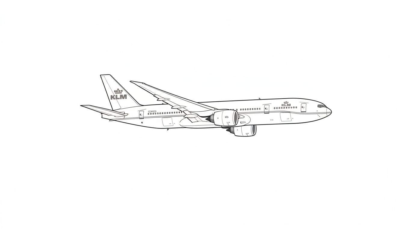 Gratis kleurplaat van een gedetailleerd zwart-wit lijntekening van een KLM passagiersvliegtuig. Perfect voor vliegtuigfans om in te kleuren. Zijaanzicht met herkenbare KLM-logo’s.