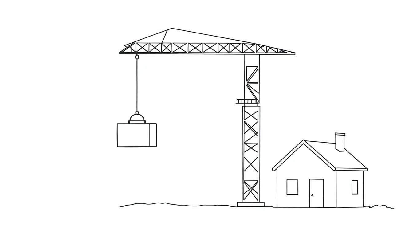 Een eenvoudige zwart-wit lijntekening van een grote torenkraan die een rechthoekige container hijst. Rechts staat een schattig huisje met een puntdak. De grond is licht golvend. Ideaal voor kinderen die van bouwvoertuigen houden.