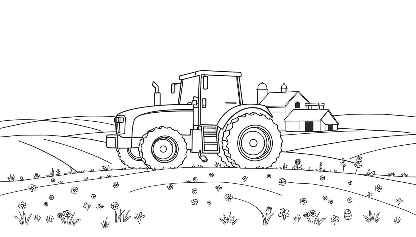 Een prachtige zwart-wit lijntekening van een rustig plattelandslandschap. In het midden pronkt een grote, moderne tractor op een glooiende weide. Op de achtergrond rijzen boerderijgebouwen, waaronder een schuur en twee silo’s, op uit een lichte verhoging. Het landschap wordt verder gesierd door glooiende heuvels en velden. De voorgrond en omgeving van de tractor zijn weelderig begroeid met gras en talrijke kleine bloemetjes. Als een vrolijke verrassing ligt er rechtsonder een versierd paasei tussen de bloemen, wat deze kleurplaat een feestelijk tintje geeft. Ideaal voor kinderen om in te kleuren en zich te vermaken.