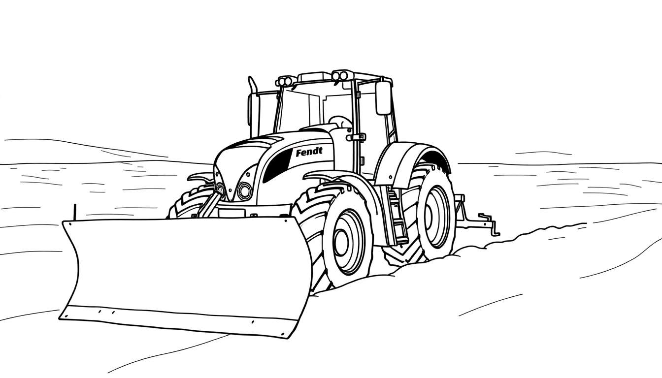 Deze vrolijke zwart-wit lijntekening nodigt je uit om je creativiteit de vrije loop te laten! We zien een stoere Fendt tractor, herkenbaar aan het Fendt-logo op de motorkap. Aan de voorkant is een flinke sneeuwschuiver bevestigd, klaar om de weg vrij te maken. De tractor staat op de voorgrond, schuin van voren gezien, en lijkt dwars door een besneeuwd of modderig landschap te ploegen. De lijnen op de grond rond de wielen en de schuif geven het gevoel van beweging en activiteit. De achtergrond is simpel gehouden, met een open landschap en een duidelijke horizon, zodat alle aandacht uitgaat naar de tractor.
