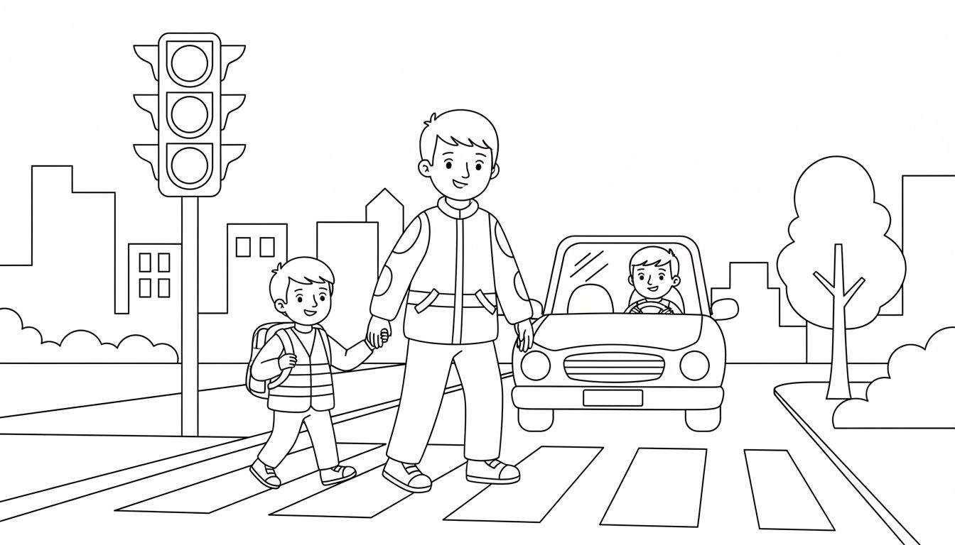 Deze vrolijke kleurplaat neemt kinderen mee naar een levendig straatbeeld waar verkeersveiligheid centraal staat. In het midden zien we een vader en zijn zoontje, stevig hand in hand, die veilig de straat oversteken op een zebrapad. Het jongetje, uitgerust met een rugzak, en de man dragen beiden reflecterende veiligheidsvestjes – een duidelijk signaal dat veiligheid voorop staat. Links van hen torent een verkeerslicht boven de weg uit, klaar om het verkeer te regelen. De leegte van de lichten nodigt uit tot het bedenken van de kleuren die het spel van rood, oranje en groen zullen creëren.