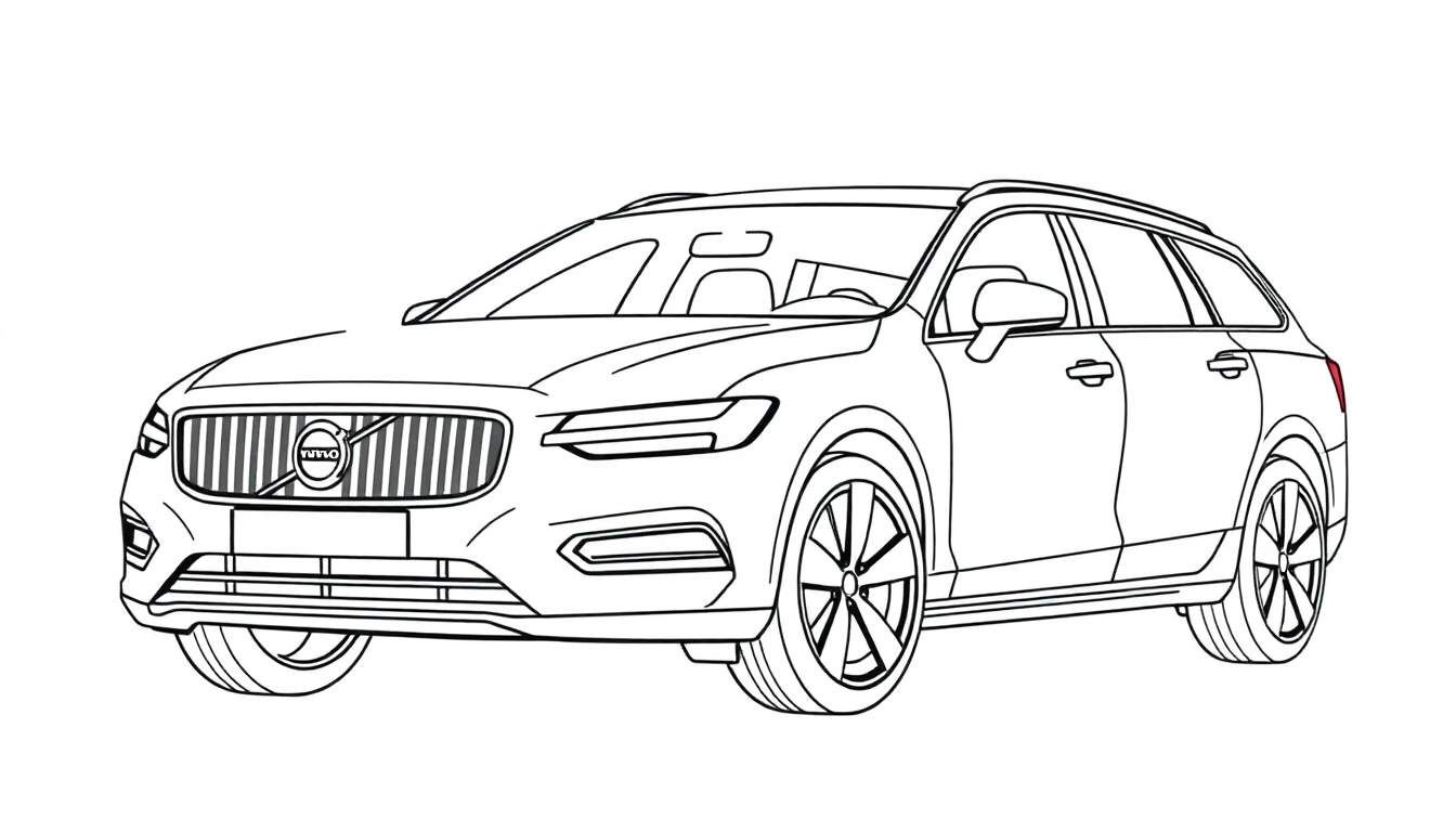 Stap in de wereld van auto-ontwerp met deze fascinerende kleurplaat! Deze gedetailleerde lijntekening toont een stationwagon, sterk lijkend op een Volvo V90, vanuit een dynamisch driekwart vooraanzicht. Elk detail is met precisie weergegeven, van de kenmerkende grille met verticale spijlen en het subtiele Volvo-logo tot de gestroomlijnde dakrails en de moderne spaakwielen. De eenvoudige, strakke lijnen op een witte achtergrond nodigen uit tot creativiteit en bieden een uitstekende oefening in fijne motoriek en kleurherkenning.