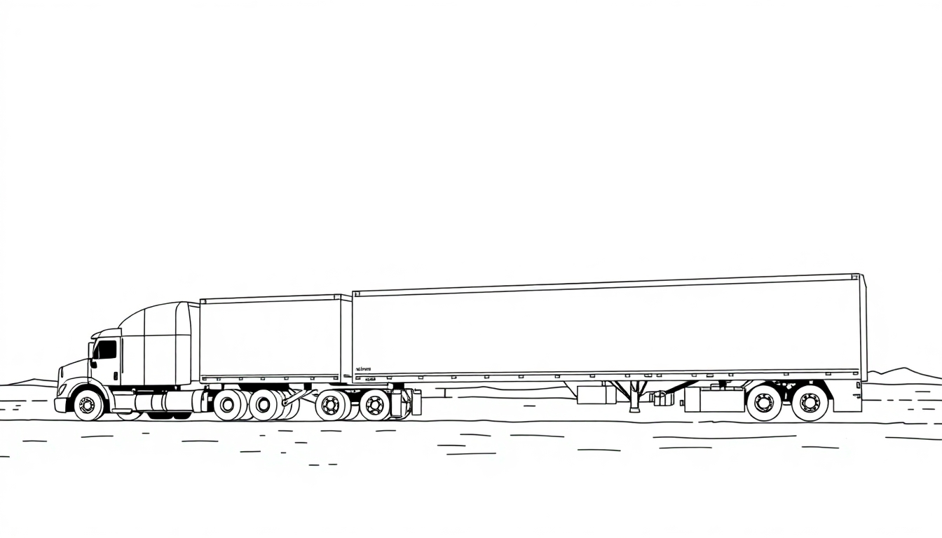 Gratis kleurplaat van een indrukwekkende zwart-wit lijntekening van een lange vrachtwagencombinatie met twee opleggers, waarvan de achterste aanzienlijk langer is. Perfect voor creatieve kinderen die van voertuigen houden.