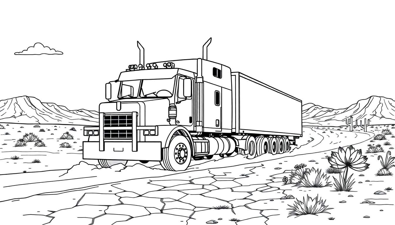 Stap achter het stuur van je fantasie met deze adembenemende kleurplaat! Centraal op de afbeelding staat een machtige Amerikaanse trekker-oplegger, met zijn kenmerkende lange motorkap en indrukwekkende grille. Deze kolos van metaal snijdt door een uitgestrekt, zonovergoten woestijnlandschap. Bovenop de cabine glinsteren de hoge uitlaatpijpen en extra verlichting, klaar om de horizon te veroveren. De weg onder de wielen is niet zomaar een pad; het is een getuigenis van de droogte, met talloze scheuren en barsten die de intense hitte van de woestijn verklappen. Aan weerszijden van deze stoffige ader ontvouwt zich een typisch woestijnpanorama: robuuste struiken en opvallende woestijnplanten, waaronder enkele statige cactussen die de scène accentueren. In de verte tekenen zich golvende bergketens af, die de uitgestrektheid van dit ruige terrein benadrukken. Zelfs de lucht draagt bij aan het gevoel van isolatie, met slechts een enkele, vredige wolk die voorbij drijft.