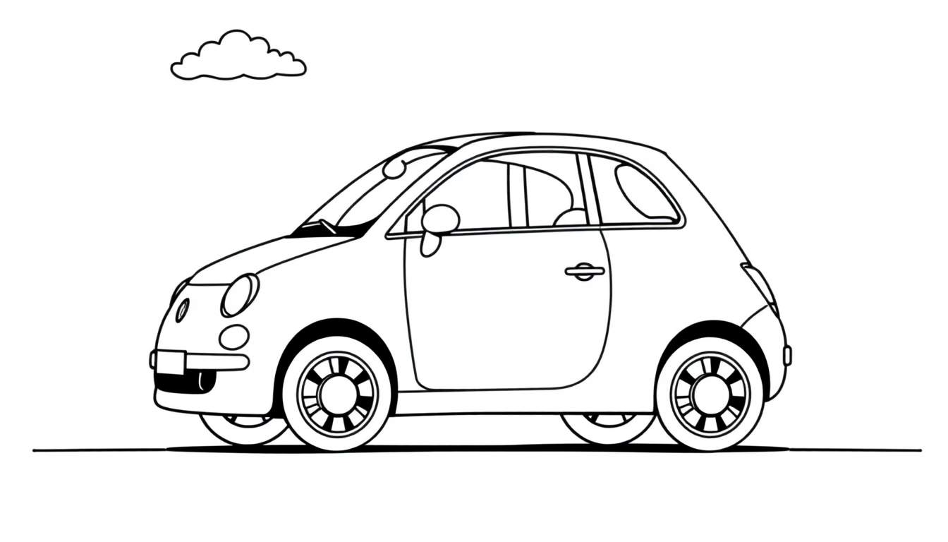 Deze charmante zwart-wit lijntekening nodigt jonge creatievelingen uit om hun favoriete kleuren tevoorschijn te halen en deze compacte auto tot leven te brengen. De tekening, in een vrolijke cartoonachtige stijl, toont een auto in zijprofiel met een speelse draai naar voren. Je ziet duidelijke details zoals de grote, ronde koplampen en een kleinere ovale lamp, vier wielen met gedetailleerde velgen, twee deuren met deurklinken, en heldere zijramen en voorruit. Een zijspiegel aan de bestuurderskant maakt het plaatje compleet. Boven de auto zweeft een vriendelijk, gestileerd wolkje, terwijl de auto stevig op een rechte lijn staat die de weg voorstelt. Het is de perfecte combinatie van eenvoud en leuke details om de fantasie te prikkelen.