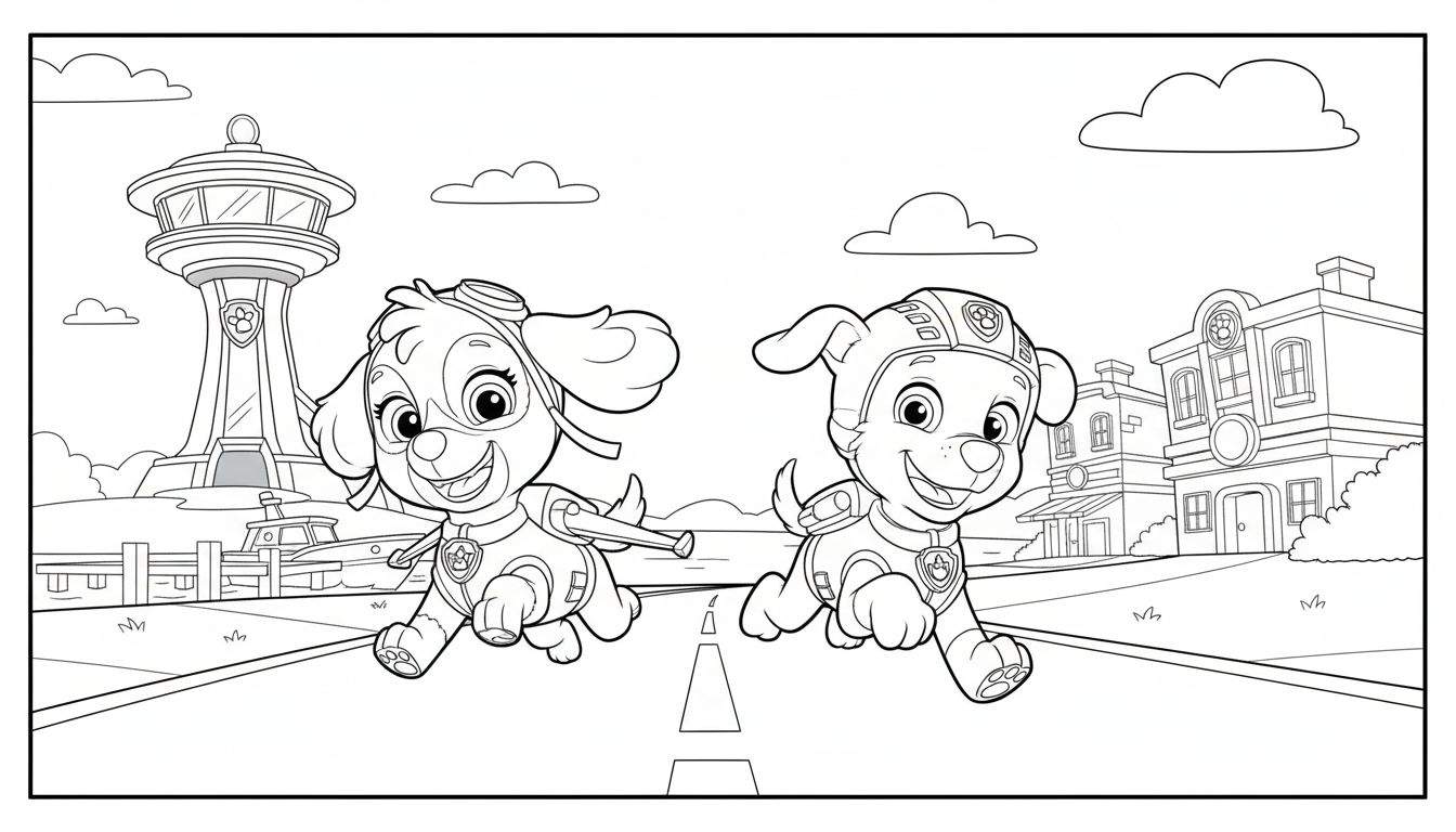 Dynamische kleurplaat van Paw Patrol’s Skye en Marshall, vrolijk rennend of vliegend over een weg door Adventure Bay. Skye draagt haar roze pilotenoutfit naast Marshall in zijn rode brandweeruniform. Op de achtergrond zijn de Paw Patrol uitkijktoren, water met een boot en karakteristieke gebouwen van Adventure Bay te zien. Perfect om in te kleuren!
