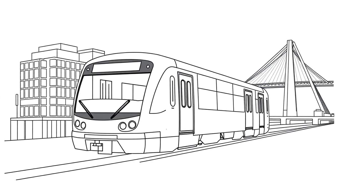 Gratis kleurplaat van een moderne metro op de rails, geflankerd door hoge stadse gebouwen en een indrukwekkende tuibrug. Perfect voor uren tekenplezier!