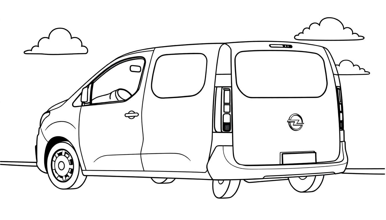 Gratis kleurplaat van een zwart-wit lijntekening van een Opel bestelwagen of personenbusje, gezien vanuit de achter-driekwart hoek. Perfect voor creatieve kinderen en volwassenen om in te kleuren. Inclusief details zoals achterlichten, schuifdeur en het Opel logo. Ideaal voor autoliefhebbers en iedereen die van tekenen houdt.