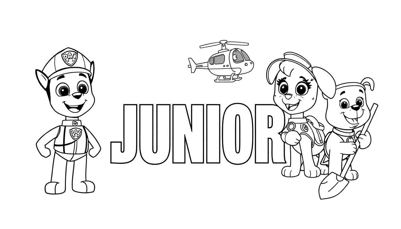 Laat de creativiteit van je kinderen de vrije loop met deze fantastische Paw Patrol junior kleurplaat! Deze vrolijke tekening zit vol met geliefde personages en leuke elementen, perfect voor urenlang kleurplezier. In het midden pronkt het woord “JUNIOR” in grote, duidelijke letters, een geweldige uitdaging voor jonge kunstenaars om in te kleuren. Boven dit woord zweeft een schattige helikopter, klaar om samen met de helden op missie te gaan. Deze kleurplaat is ontworpen met duidelijke lijnen, ideaal voor kleine handjes die hun fijne motoriek willen oefenen.