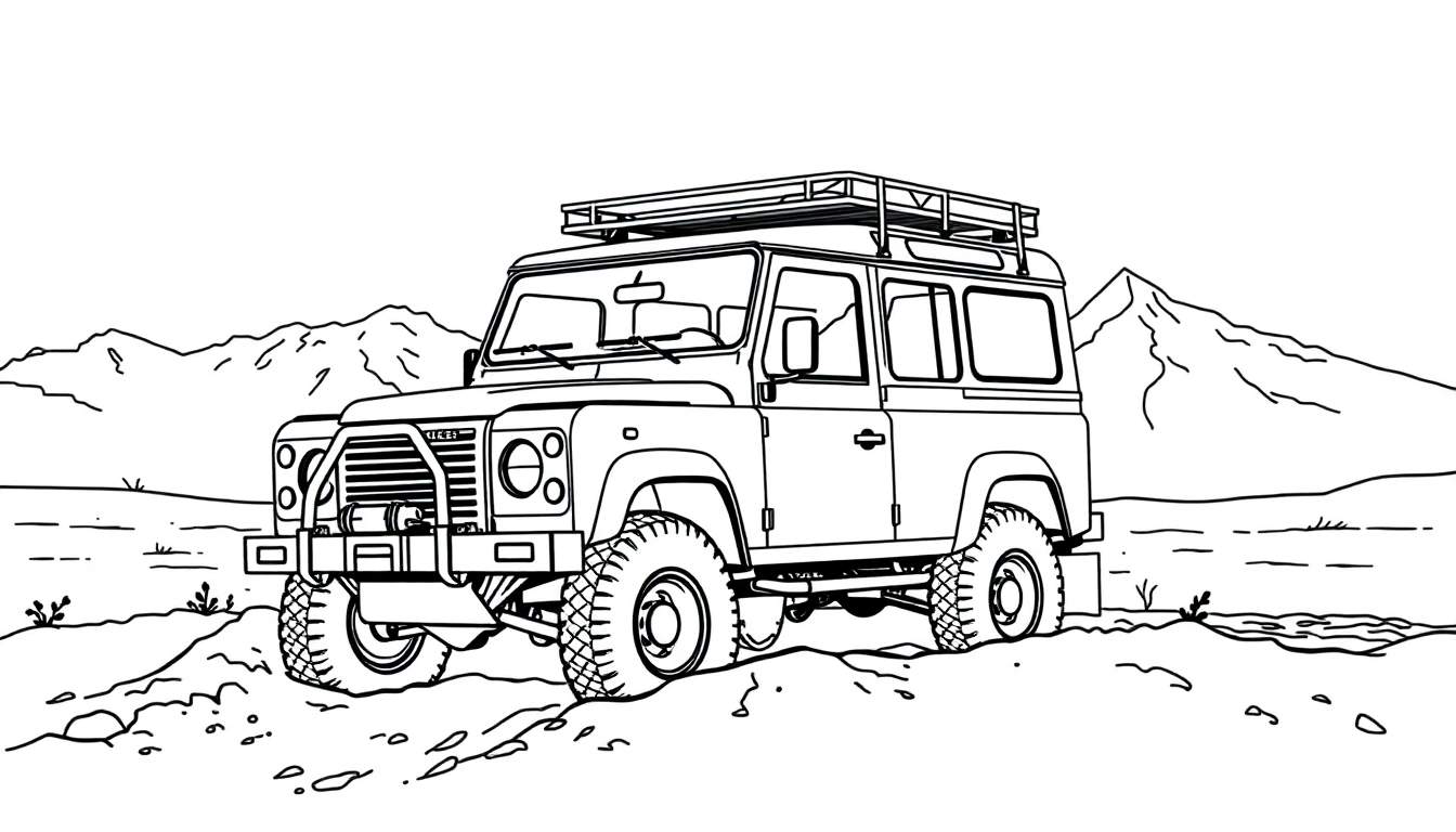 Stap in de wereld van off-road avontuur met deze fantastische kleurplaat! Centraal staat een stoere terreinwagen, met een robuuste uitstraling die doet denken aan de iconische Land Rover Defender. Vanuit een unieke hoek, waarbij de voorkant en rechterzijkant zichtbaar zijn, straalt dit voertuig pure kracht en avontuur uit. Elk detail is met zorg getekend om jouw kleurtalent te prikkelen: van de indrukwekkende beschermbeugel (bull bar) met geïntegreerde lier aan de voorkant tot de brede, grove off-road banden die klaar zijn om elk terrein te bedwingen. De klassieke, hoekige lijnen van een echte terreinwagen zijn duidelijk aanwezig, en de dakdrager suggereert dat er genoeg ruimte is voor al je avontuurlijke uitrusting.
