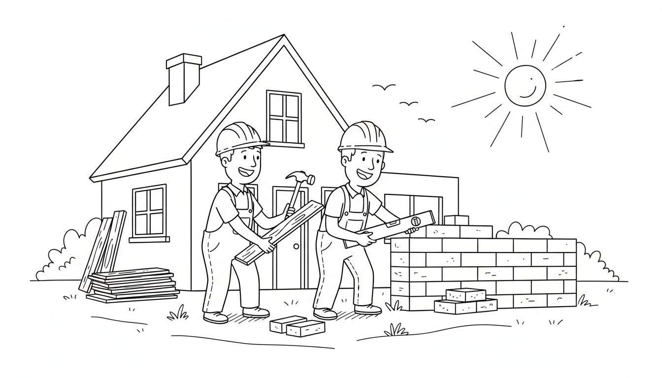 Kleurplaat met twee lachende bouwvakkers die aan het werk zijn. Ze bouwen een huis, met materialen zoals hout en bakstenen. Op de achtergrond is een deel van het huis te zien, met een schoorsteen en ramen. Een lachende zon en vliegende vogels maken de vrolijke sfeer compleet.
