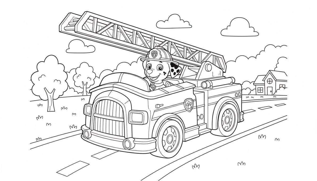 Marshall Paw Patrol Kleurplaat – Lachende Dalmatiër in Brandweerwagen