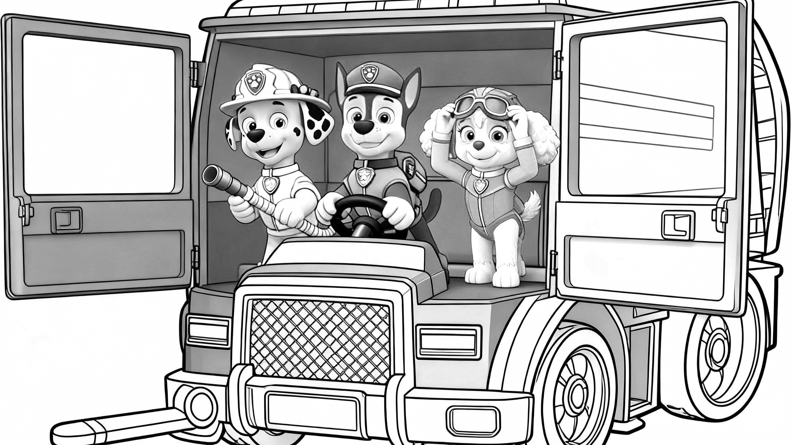 Op deze Paw Patrol kleurplaat zie je Marshall, Chase en Skye vrolijk en enthousiast zittend in de cabine van een groot reddingsvoertuig. Marshall, de dalmatiër brandweerhond, zit links met zijn brandweerhelm en houdt een slang vast. Centraal achter het stuur zit Chase, de Duitse herder politiehond, in zijn uniform en pet. Rechts staat Skye, de cockapoo piloot, met haar vliegerpak en vliegersbril. De deuren van het voertuig staan open, wat suggereert dat ze klaar zijn voor een nieuw avontuur.