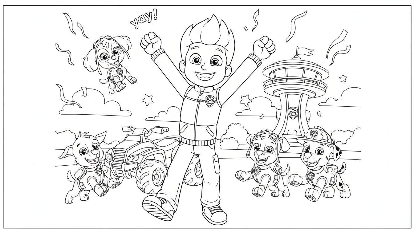 Duik in de feestelijke wereld van Paw Patrol met deze levendige zwart-wit kleurplaat! Ryder, de dappere leider, staat centraal met triomfantelijk opgeheven armen en een brede glimlach. Om hem heen viert het hele team mee: Skye zweeft vrolijk in de lucht met haar vliegbril en een ‘yay!’, terwijl Rocky naast zijn terreinwagen rent. Marshall, herkenbaar aan zijn brandweerhelm, en Chase (met zijn politiepet) spurten voor de iconische Paw Patrol uitkijktoren. De scène is rijkelijk versierd met door de lucht vliegende slingers en confetti, wat de feeststemming compleet maakt. Wolken en sterren op de achtergrond voegen een dromerig tintje toe. Een dynamische afbeelding, perfect om met al je favoriete kleuren tot leven te brengen!